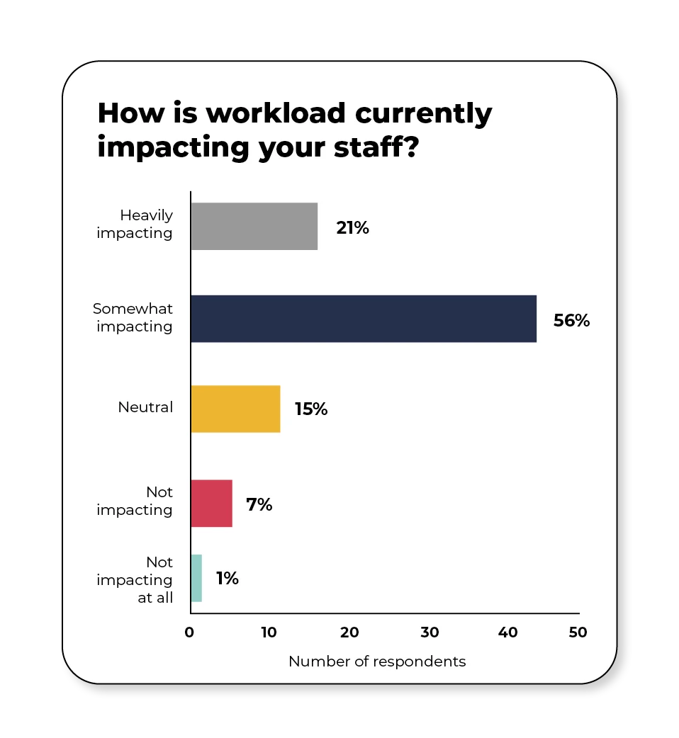 Workload remains a major concern, with more than three quarters of respondents (77%) saying it is either ‘somewhat impacting’ or ‘heavily impacting’ their staff.