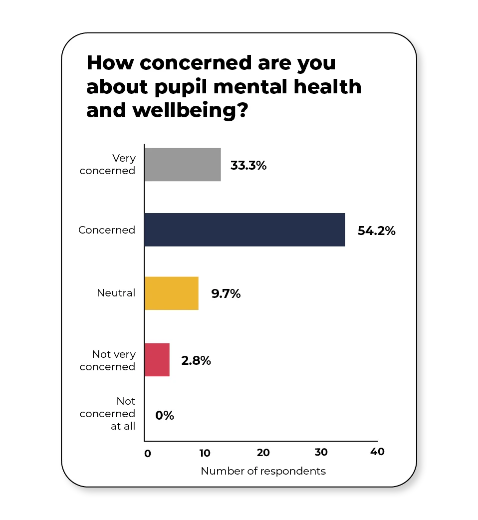 - 87.5% of Headteachers say they are ‘concerned’ or ‘very concerned’ about pupil mental health and wellbeing within their school.