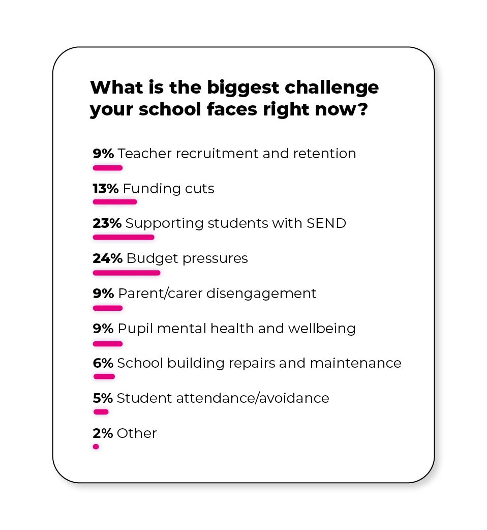 Schools are facing a wide range of challenges, with budget pressures (24%) and supporting students with SEND (23%) identified as the most significant.
